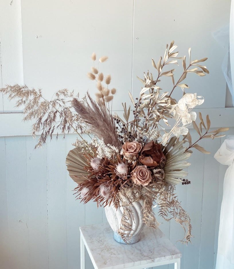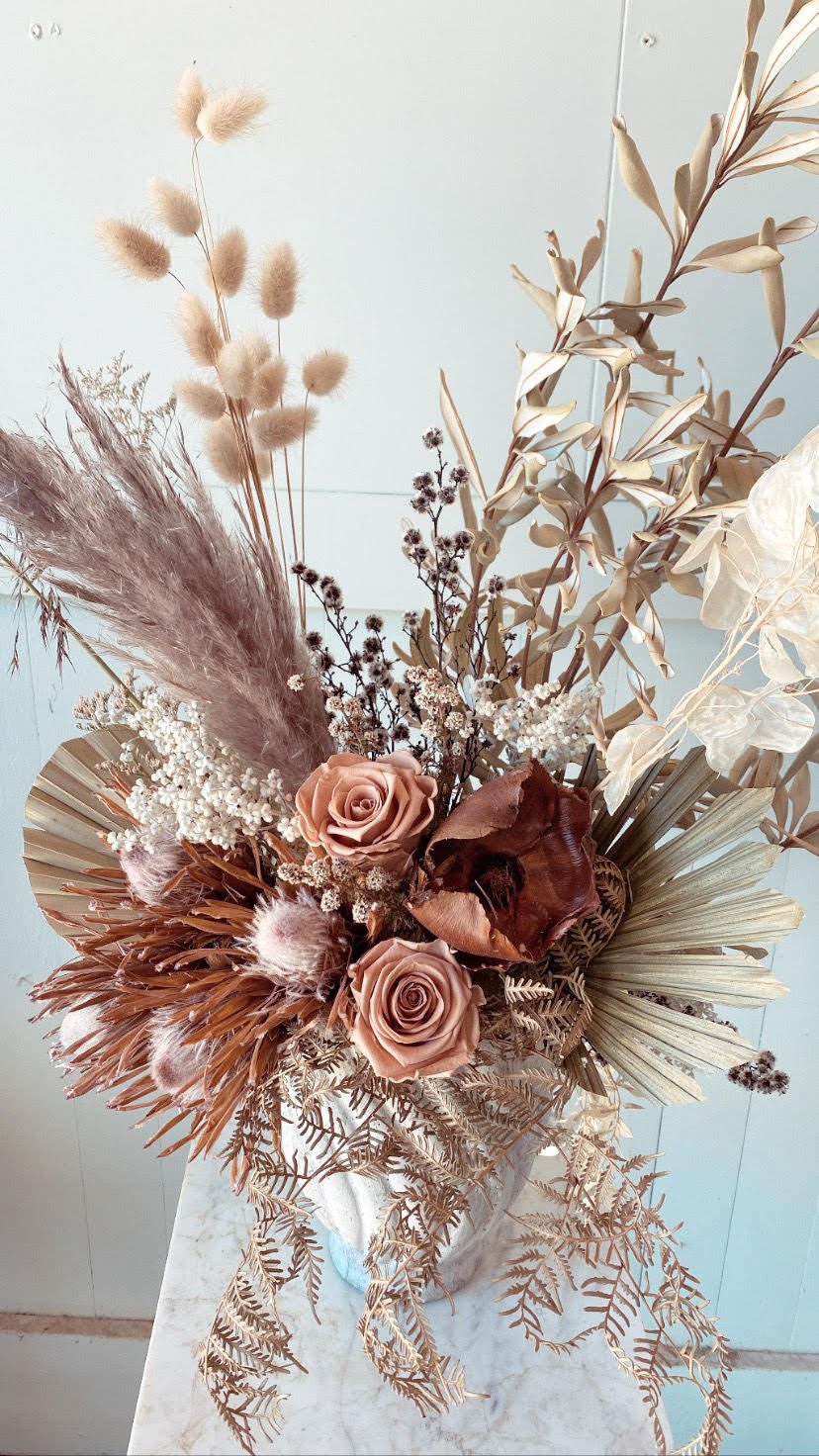We have created these beautiful arrangements using a wide selection of dried flowers, flowers you may find in your arrangements are cotton. scabiosa pods, stirlingia, teasels, paper daisy, eucalyptus, smoke bush, tea tree, lotus pods, rice flower, billy buttons, dried banksia and proteas.
